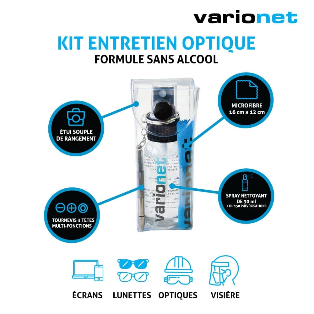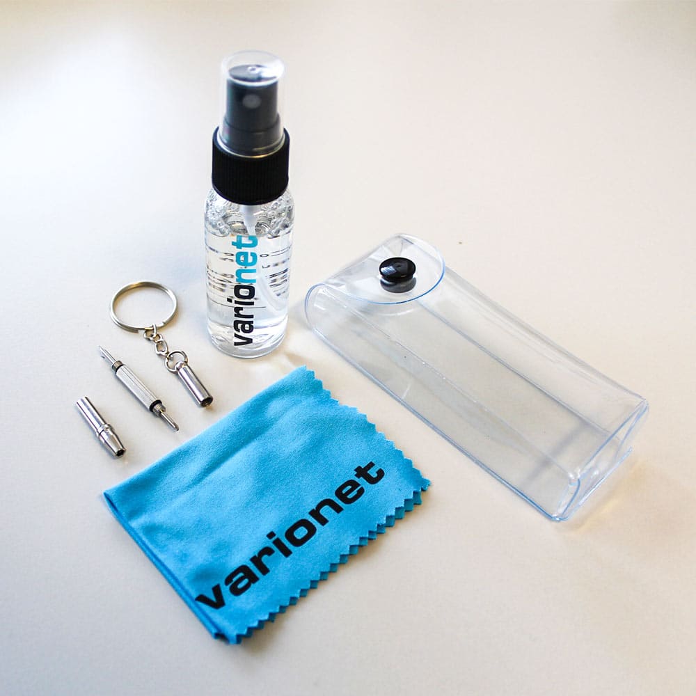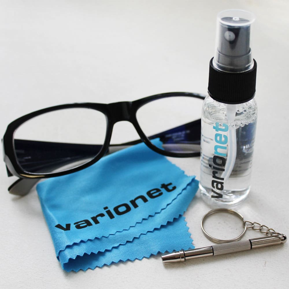 To effectively clean your glasses and lenses, use the Varionet Optical Cleaning Kit, consisting of a 30 ml cleaning spray, a microfibre cloth and a key ring screwdriver.