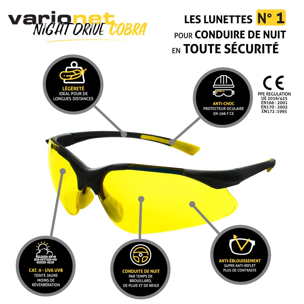 Their yellow tint provides more brightness and their multi-layer anti-reflective treatment protects you from the glare of headlights. They are therefore ideal at dusk and dawn. The Varionet Night Cobra driving glasses equipped with yellow lenses give you more clarity and better contrast, you will be less tired after long hours of night driving.